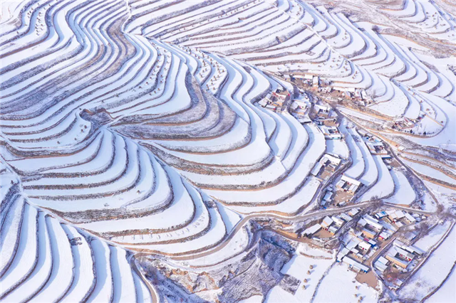 白银市会宁县层层叠叠的梯田与皑皑白雪交相辉映,构成了一幅壮丽的冬日画卷。