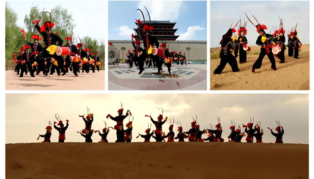 凉州攻鼓子的表演,如龙腾虎跃般自由洒脱。表演者基本两人一对,八人一组,身背红鼓,身着黑色“十三太保衣”,足蹬快靴,头戴黑幞帽,帽上插两支野鸡翎,气质形象宛如一个个古代武士,气度非凡。表演时,他们的表情冷峻刚毅,动作刚劲有力,步伐沉稳矫健,每一次鼓点的起落,都满载武威的文化韵律;每一次阵法的变幻,皆演绎着武威传统文化的故事。