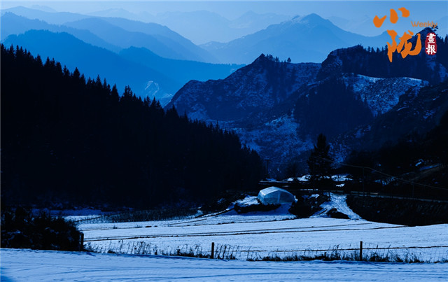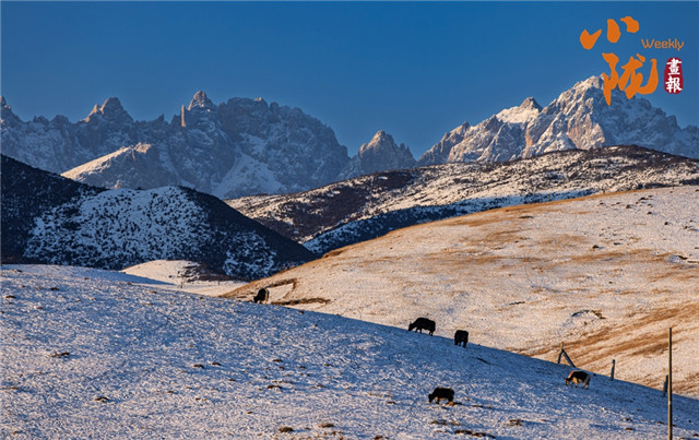 群峰巍峨,大地银装素裹,格外的美丽圣洁、雄浑苍茫,牦牛和羊群在雪地里自由觅食,为这寂静的天地增添了几分生机。