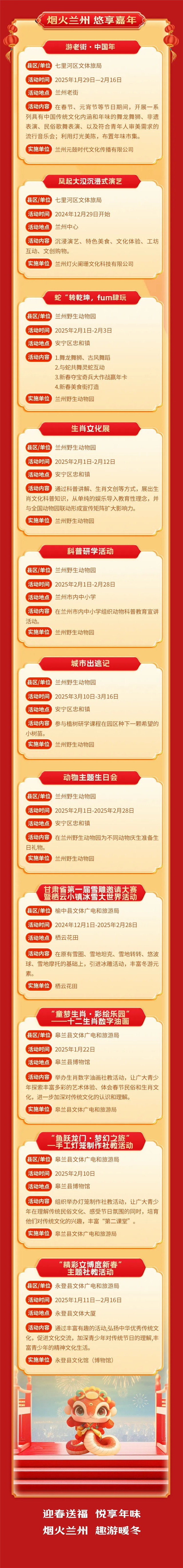 逛春节庙会、观精品好戏、赏特色年俗、品知识书香,就在“烟火兰州”。随着2025年春节的脚步越来越近,兰州文旅精心筹备组织了“烟火兰州贺新春”百项精彩文旅活动辞旧迎新,内容涵盖惠民文艺演出、公共文化服务、非遗体验展示、文化娱乐活动、旅游休闲消费、文博展览展出、文旅优惠福利等,旨在营造欢乐祥和的节日氛围,满足市民和游客对春节文化旅游生活的美好期待。