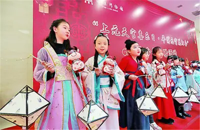 儿童在甘肃平凉市博物馆身穿中国传统服饰进行花灯会走秀。吴希会摄/光明图片