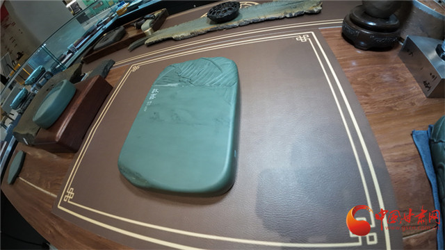 张斌介绍,甘肃洮砚以其石质温润滑腻、发墨快而不损毫、储墨久而不干涸的特点称誉文坛,为历代文人所青睐。随着老坑石料开采枯竭,每一块洮砚石材都弥足珍贵,作为洮砚雕刻者,面对石料第一步肯定不是雕刻,而是冥想和构思。