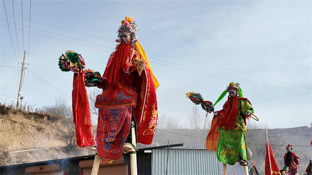在社火队伍中,高跷表演尤为引人注目。身穿绚丽服饰的关公、赵子龙等角色,踩着高低不同的木跷,身姿挺拔、步伐轻盈地随着鼓点前行,引得周边村民们紧跟队伍,不舍离去。而那位形象特别、动作夸张的婆子,更是让周边村民哈哈大笑,整个现场充满了欢乐的气氛。