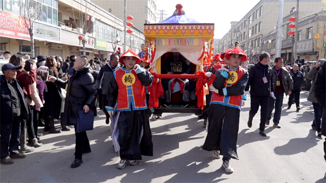 随后,民众高举四十八面龙凤彩旗、二十四节气彩旗和十二生肖旗帜,寓意风调雨顺,岁岁平安,祥和喜庆。锣鼓震天动地,礼花竞相绽放,鞭炮此起彼伏,彩旗迎风招展。最后在十字路口驻轿,由“老爷”简短训话,内容为春节伊始,打扫街道,注意火患,风调雨顺,国泰民安之类祝福话语。