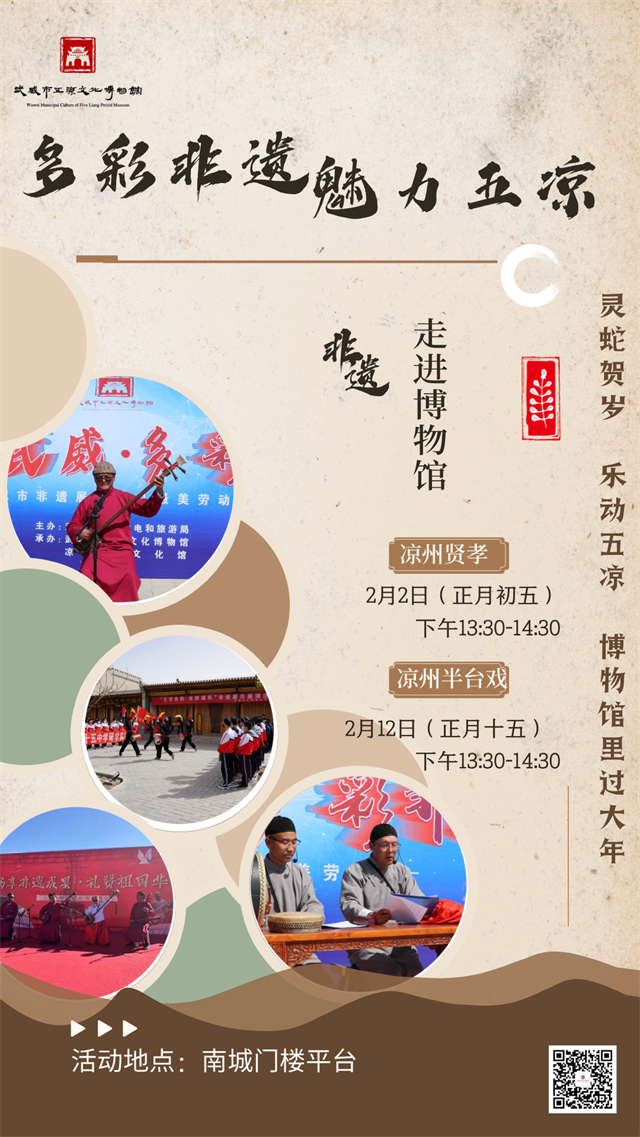 活动内容:邀请皮影戏、凉州贤孝、凉州半台戏等非遗传承人亮相南城门楼,演绎非遗之美,为大家送上新春祝福,丰富群众精神文化生活。
