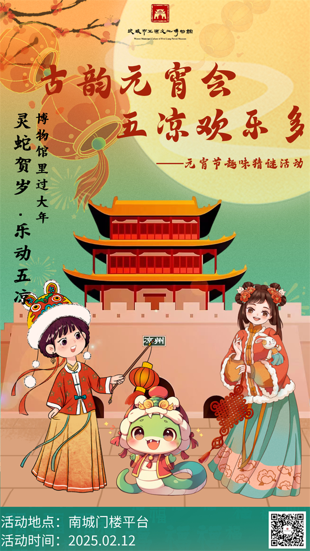 活动内容:参观《河西都会 天马故乡》基本陈列展,了解古代人的衣食住行,一起寻找文物中的“蛇”元素;在武博小课堂学习元宵节的由来和习俗;体验非遗纸浆画,制作“灵蛇送福”木版画。