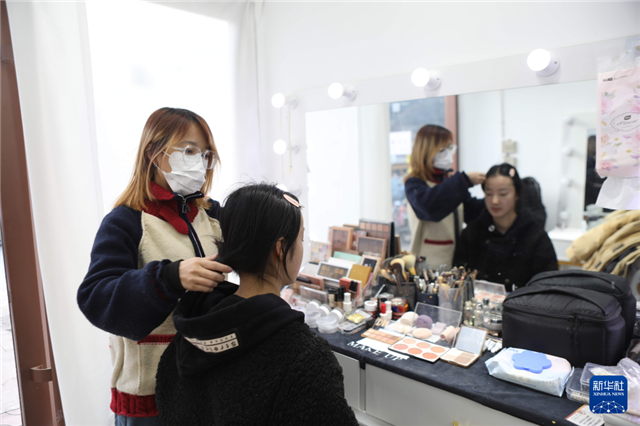 蒙春芳(左一)正在给客人化妆。新华社记者张睿 摄