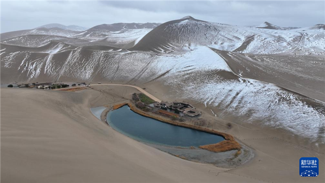 这是2014年11月23日拍摄的敦煌市鸣沙山月牙泉景区雪景(无人机照片)。新华社发(张晓亮摄)