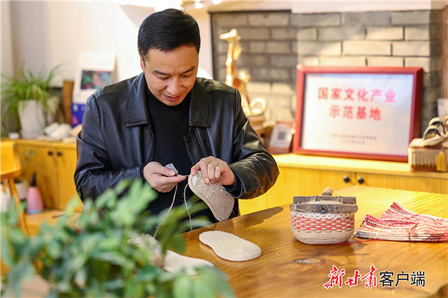 近日,在甘谷县“雅路人”麻鞋销售点,公司总经理牛君俊正制作一款麻编新产品,这款新产品将参加全省非遗文创产品大赛。