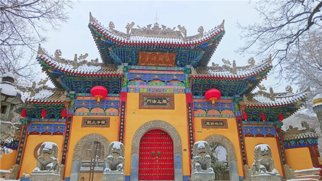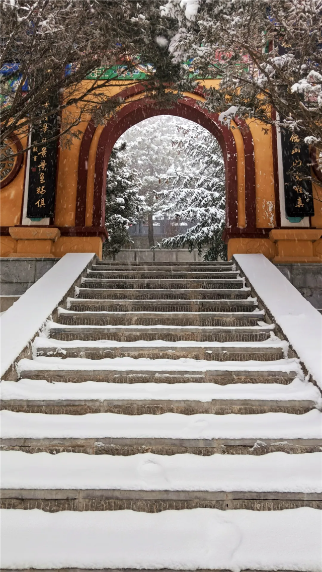 春雪飘洒,山上的八台九宫十二院皆被白雪覆盖,朱墙黛瓦若隐若现,宛如千年道韵凝成的剪影。雪中的凌空塔、皇城,褪去了往日的庄严,多了几分朦胧的温柔。古松虬枝挂满雾凇,雪粒簌簌坠落的瞬间,仿佛能听见广成子与黄帝论道的玄音。山间的莲花寺、灵龟台在雪色中更显静谧,偶有钟声回荡,惊起几只飞鸟,抖落一树琼花,恰似“一花一世界”的顿悟。