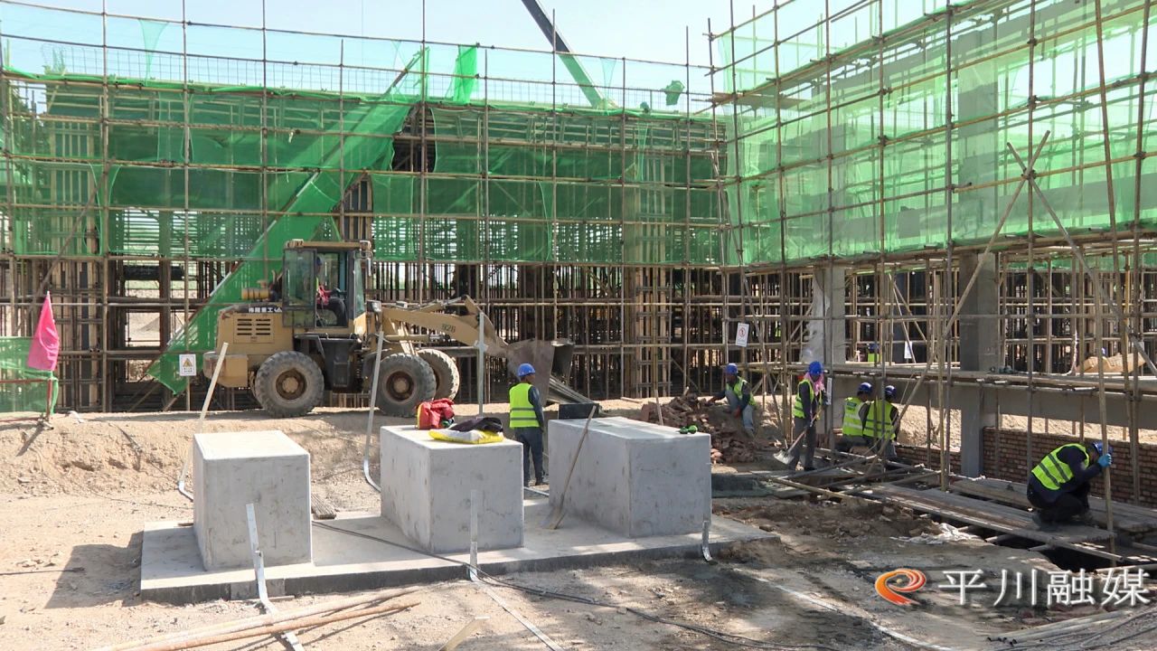 山东发展投资(平川)B区20万千瓦风电项目装机容量200MW,拟安装32台单机容量6.25MW的风电机组。走进项目施工现场,塔吊高耸、长臂挥舞,施工车辆往来穿梭,工人们头戴安全帽,忙碌而有序地开展作业,现场呈现出一派热火朝天的建设景象。