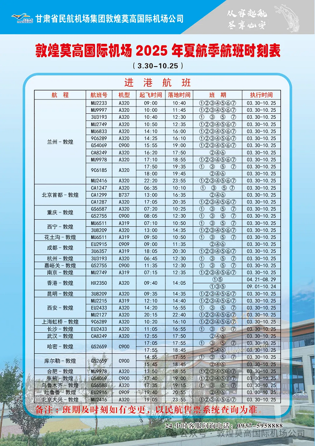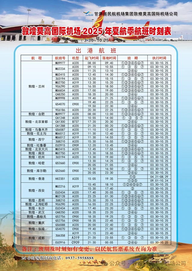2025夏航季(3.30-10.25)新增航线超多:乌鲁木齐、武汉、香港包机直飞,兰州快线每天11班,北京/西安每日3班,上海1班。