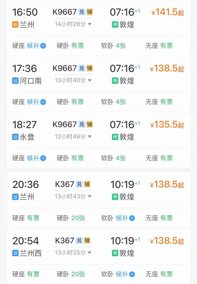 如果您从兰州或嘉峪关出发,剩下的路程搭乘火车也是一个不错的选择。