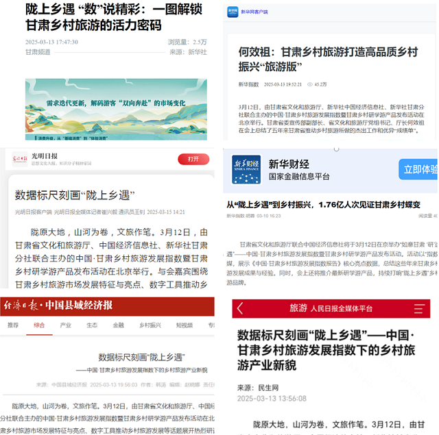 3月12日以来,新华社连续发布了《从“陇上乡遇”到乡村振兴,1.76亿人次见证甘肃乡村蝶变》《绘就乡村游锦绣诗篇 指数见证甘肃乡村旅游“一路繁花”》《数据标尺刻画“陇上乡遇”——“中国·甘肃乡村旅游发展指数”下的乡村旅游产业新貌》《记者手记:千面甘肃乡村——在烟火气中触摸振兴的脉搏》《“陇上乡遇”品牌崛起 甘肃乡村旅游成全国游客新宠》《AIGC|陇上乡遇,重逢旧时光》《何效祖:甘肃乡村旅游打造高品质乡村振兴“旅游版”》《高清横屏看甘肃|解码乡村与游客“双向奔赴”的六大消费新趋势》《多方聚力共探甘肃乡村旅游发展新路径》《见证奇迹!指数视角下甘肃蓬勃发展的乡村振兴“旅游版”》等十余篇系列深度报道,从指数解读、案例挖掘、技术赋能等多维度展现甘肃乡村旅游的创新实践,引发全网热议。