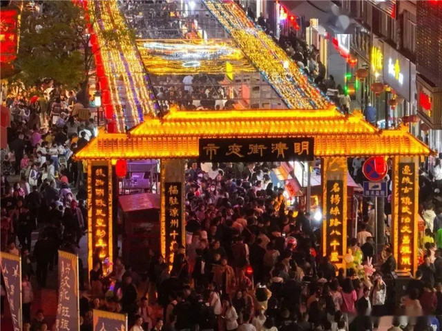 华灯初上,万家灯火,是时候看看热闹的人群,感受饱腹的满足。此时,明清街夜市里经营各种名优小吃的摊点就会支起摊位,熟悉的叫卖声,让整个夜市变得格外热闹,烟火气息十足。