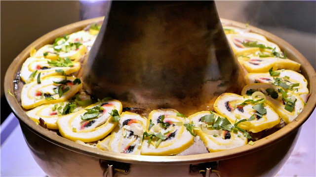 凉州菜锅子,菜肴丰富。油炸丸子、发菜卷子和牛、羊、猪肉片子,以及豆腐块子装在锅子上面,下面垫上白菜、粉条、冬瓜、油炸洋芋、海带、木耳等蔬菜,浇上兑好的肉汤,燃起锅子中的木炭,不久就会发出“咕嘟咕嘟”的煮沸声,热气腾腾之下你尽可放慢节奏,品尝锅中美味。