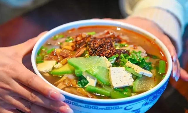 如果觉得一天的行程很满,吃米汤不抗饿,那就来一碗热气腾腾的牛肉菜面。牛肉菜面,顾名思义就是在牛肉面里加了菜,通常加的是绿油油的豆角、白嫩的豆腐和半透明的凉粉。这一简单的加工,多了些许蔬菜,使一碗面不再单调,也是武威人每天早上最爱的美食之一。