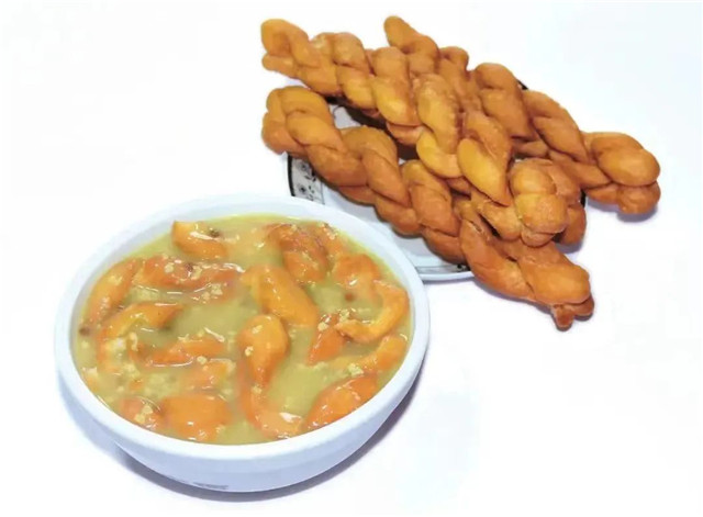 米汤油馓子是武威的特色小吃之一,味咸,并带有炝锅葱花和扁豆的香味。米汤是由扁豆和黄米在大砂锅中熬制而成,还加入了适量面粉,入口绵细香甜。点餐时一般分为两种,脆的或软的。年轻人通常喜欢吃酥脆的馓子,先将馓子掰成小段放入碗中,再盛上米汤,吸溜一口爽滑的米汤,美得很。软的则更适合小朋友和老人吃,在盛米汤的砂锅中提前泡入馓子,待吃的时候捞出,馓子已渗透了米汤的咸香,滑滑溜溜,又是另一番滋味。