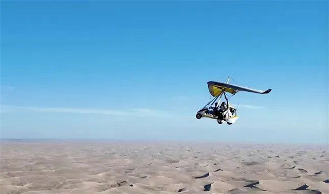 当引擎的低鸣切开晨雾,不远处的通航乐园中,动力三角翼正展开双翼书写着大漠之上的飞行史诗,掠过苏武沙漠的褶皱,草方格化作绿色琴键,在螺旋桨的气流中奏响治沙旋律。