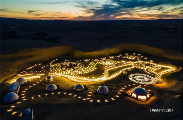 夜风起时,摘星小镇的灯光次第亮起。天文望远镜里,你寻找的北斗七星,正落进沙丘背后刚栽种的梭梭林。摘星小镇整体设计轴线以“银河”为中心,“栖身银河,手可摘星”,宛如茫茫太空中的一处星际基地,身处其中,仿佛漫步银河。
