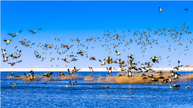 晨光初吻沙脊时,一汪翡翠坠入大地的裂痕。风把巴丹吉林的沙粒磨成金粉,却在此处,被万顷碧波驯服。沙丘如慵懒的巨兽匍匐在岸,白鹳掠过时投下细长的箭影,惊醒了沉睡的芦苇荡,那些细密的绿在咸涩的风里翻涌,像是诸神遗落的针线,将沙漠与碧水缝合。
