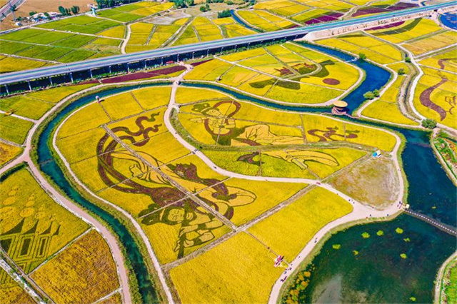 稻田艺术景观中,金黄色稻田被精心雕琢成各种人物和动物图案,展现当地丰富文化内涵。稻田间的小路水渠增添层次感,整齐农田与远处建筑彰显农业发展与规划有序,尽显人与自然的和谐共生。