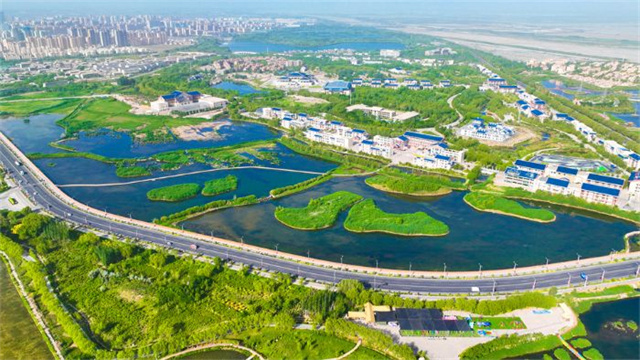 张掖湿地,那片广袤的绿洲,是大自然慷慨的馈赠。绿意盎然的植被与蜿蜒水道交织,大小岛屿星罗棋布,水道纵横交错,清澈水面倒映蓝天,宁静祥和之感扑面而来。周边错落有致的建筑与自然完美融合,远处城市轮廓若隐若现,黑河湿地水鸟翩跹,荒漠与绿洲的奇迹共生,诠释着西北最极致的生态画卷。