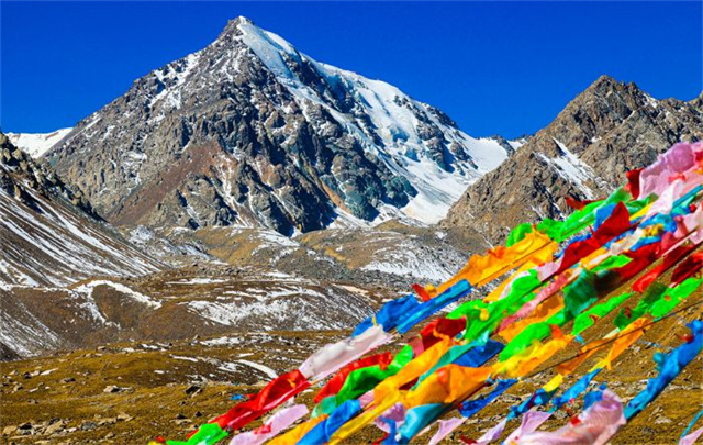 五彩经幡在风中飘扬的山脉间,更是为张掖增添了一份神秘的文化气息。蓝天之下,五彩经幡与雪山、荒草地相互映衬,象征着祈福与吉祥,诉说着这片土地深厚的文化底蕴。