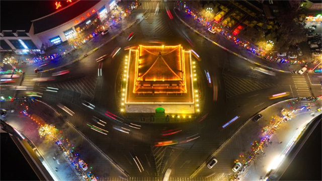 当夜幕降临,张掖展现出别样的现代魅力。被灯光环绕的钟鼓楼矗立在交通环岛中心,金黄灯光璀璨夺目,车流形成的光轨交织其中,暖色调灯光营造出温馨繁华氛围,将城市的繁忙与活力展现得淋漓尽致,吸引着游客沉醉在这迷人的夜色里。