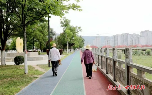 傍晚的西汉水畔,74岁的王大爷在西汉水风情线的公园里打着太极,一旁有在秦篆书法文化墙前教孩子识字的家长和24孝故事碑前驻足观看的小朋友,身后是跳广场舞的年轻人,不远处智慧健身步道的电子屏实时显示运动数据。西汉水风情线将先秦文化和传统文化融入景观设计,用景观设计传承中华优秀传统文化,成为居民心中的“城市客厅”。这样的改变随处可见:乡村戏台既唱秦腔老调,也放数字电影;新建的礼县中医医院,住院楼采用仿古屋檐设计。盐官镇屋面的小青瓦、屋面的檐口,墙面的灰砖配白水勾缝线条,及鸭蛋青墙面,都体现出浓厚的秦汉风格。