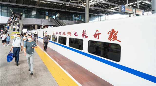广州至成都“彩虹张掖·七彩丹霞”和谐号冠名列车(张掖市融媒体中心供图)
