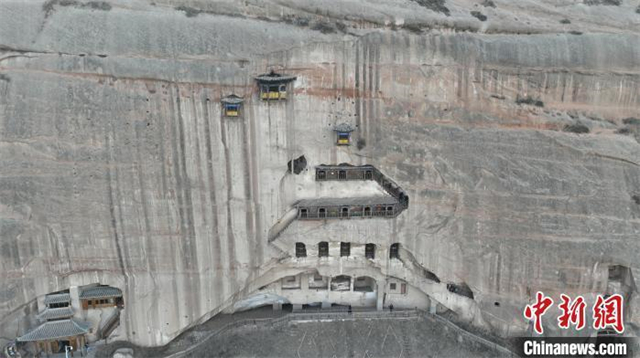 4月8日,甘肃张掖市,悬崖峭壁上的马蹄寺石窟。(无人机照片)九美旦增 摄