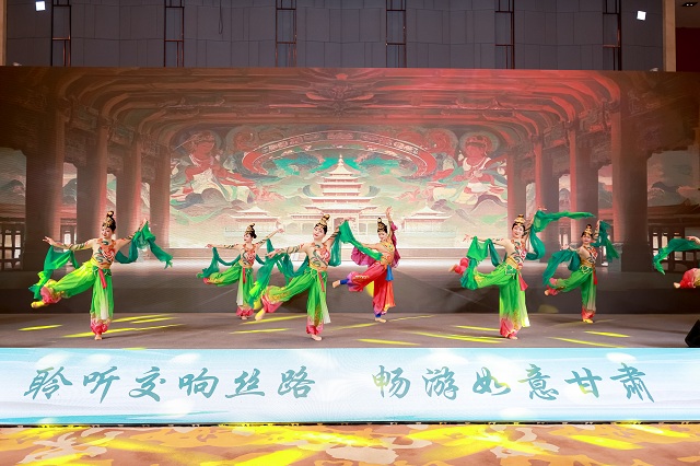 舞蹈《多彩丝路》《千手观音》演绎了丝绸之路的多姿多彩、敦煌文化的博大精深,歌曲《推开甘肃的门》《格桑梅朵》《握住世界的手》唱出了甘肃开放包容的胸怀姿态、昂扬向上的精神风貌、握手世界的豪情壮志。推介现场,同步举办了甘肃特色文创非遗市集和“甘味”特产展示活动,汇聚夜光杯、香包、剪纸、苹果、枸杞等特色产品,与会嘉宾积极参与非遗互动,品鉴地道“甘味”。