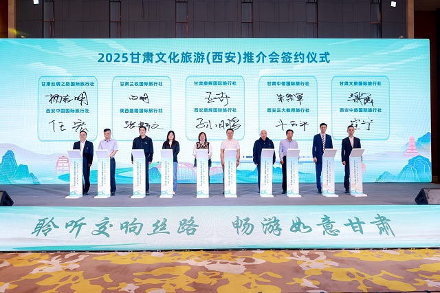 在推介环节,甘肃省文化和旅游厅以“华夏文明的发祥地”“丝绸之路的黄金段”“自然奇观的博物馆”“民族风情的大观园”“品质旅游的目的地”五大篇章为脉络,从五重维度深情讲述了甘肃的过去、现在与未来,全面展现了甘肃文旅的独特魅力,让与会嘉宾触摸了一个历史与现代交织、文化与生活共存的甘肃。兰州文旅集团、天水麦积山大景区、平凉崆峒山大景区、陇南官鹅沟大景区通过动静相结合、古今相辉映的方式,多维度开展了文旅资源、产品线路推介,发布了旅游优惠政策。甘肃丝绸之路国际旅行社、平凉文旅产业投资集团、西安中国国际旅行社等20家文旅机构签订了合作协议。