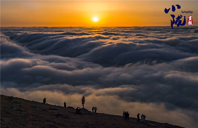 登顶远望,千坝草原高山、草甸、草原相互交织,牛马、羊群像一颗颗散落的珍珠点缀其中。茫茫云海铺满整个天际,翻涌的流云奔腾,蔚为壮观,如临于大海之滨。