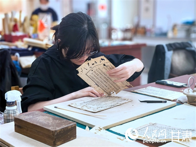4月18日,甘肃省古籍保护中心,实习生正小心翼翼地进行书籍修复。人民网记者 周婉婷 摄
