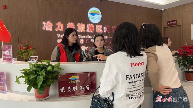 临潭县冶力关景区工作人员为游客解答疑问。