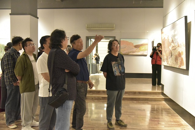 活动期间,艺术家们深入莫高窟、榆林窟、西千佛洞等石窟艺术圣地,在斑驳壁画与飞天梵音中汲取灵感;驻足阳关遗址、戈壁雅丹等地,捕捉大漠孤烟与丝路遗迹的苍茫气韵。通过现场写生与即兴创作,艺术家们以独特的艺术语言,将敦煌的自然景观、历史遗存与人文风情凝练于画布,最终完成近百幅风格多样的油画作品。