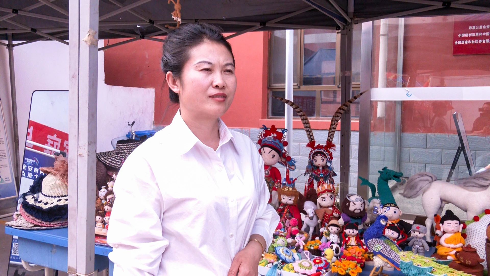 商户李万霞:“我是平川区‘毛线编织’非遗传承人。我主要做的产品有生活家居用品、衣服鞋帽、各种摆件。包括现在网上很火的哪吒、玫瑰花抱毯等等。今天在这里将我们的非遗产品推广,将这一手艺传承下去。”