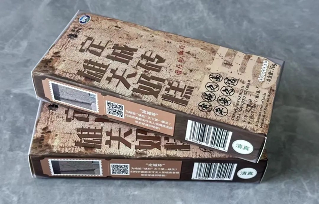“定城砖”雄关奶糕以关城“定城砖”故事为灵感设计,以独特的砖块造型吸睛,外形上遵循关城“定城砖”文物原型,复刻了“最后一砖”的独特缺口。产品外包装仿照文物造型,并添加“定城砖”故事二维码,消费者在品尝美味的同时,也能了解历史文化。