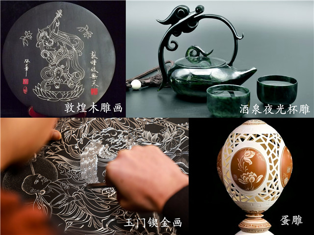 临夏积石山县冶家折花刀(保安腰刀)、酒泉肃北蒙古族银饰、甘南临潭县双龙民族工艺铜器、天水武山夜光杯雕、金昌手工地毯、嘉峪关大漠风雨雕石艺画、天水关峡竹编和平凉麦秆画、堆贴画等传统手工技艺品琳琅溢彩。
