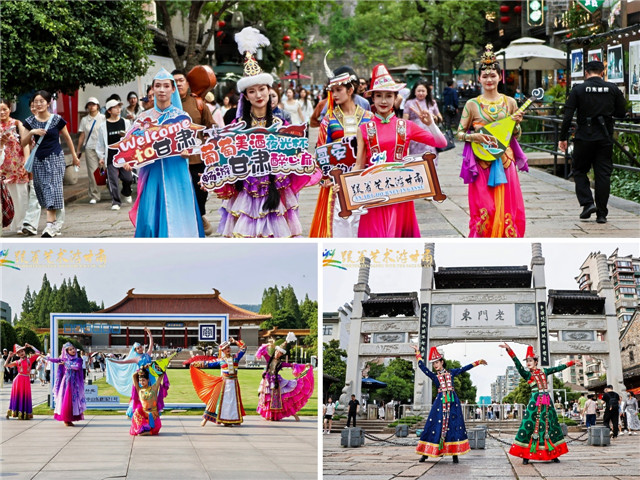 “跟着艺术游甘肃”主题快闪巡游闪现南京老门东商业街区,以“行走着的动态文艺盛宴”的形式,让观众邂逅甘肃独特的民族艺术风情。甘肃地理风情摄影展构架了一条视觉长廊,以壮美影像引领观众神游河西走廊与甘南草原。