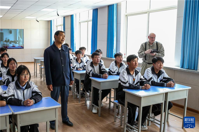 在甘肃省定西市岷县职业中等专业学校的“花儿进校园”课堂上,“洮岷花儿”国家级代表性传承人刘郭成(中)为学生们传授“花儿”技艺,高文厚在一旁拍摄(6月13日摄)。新华社记者 郎兵兵 摄