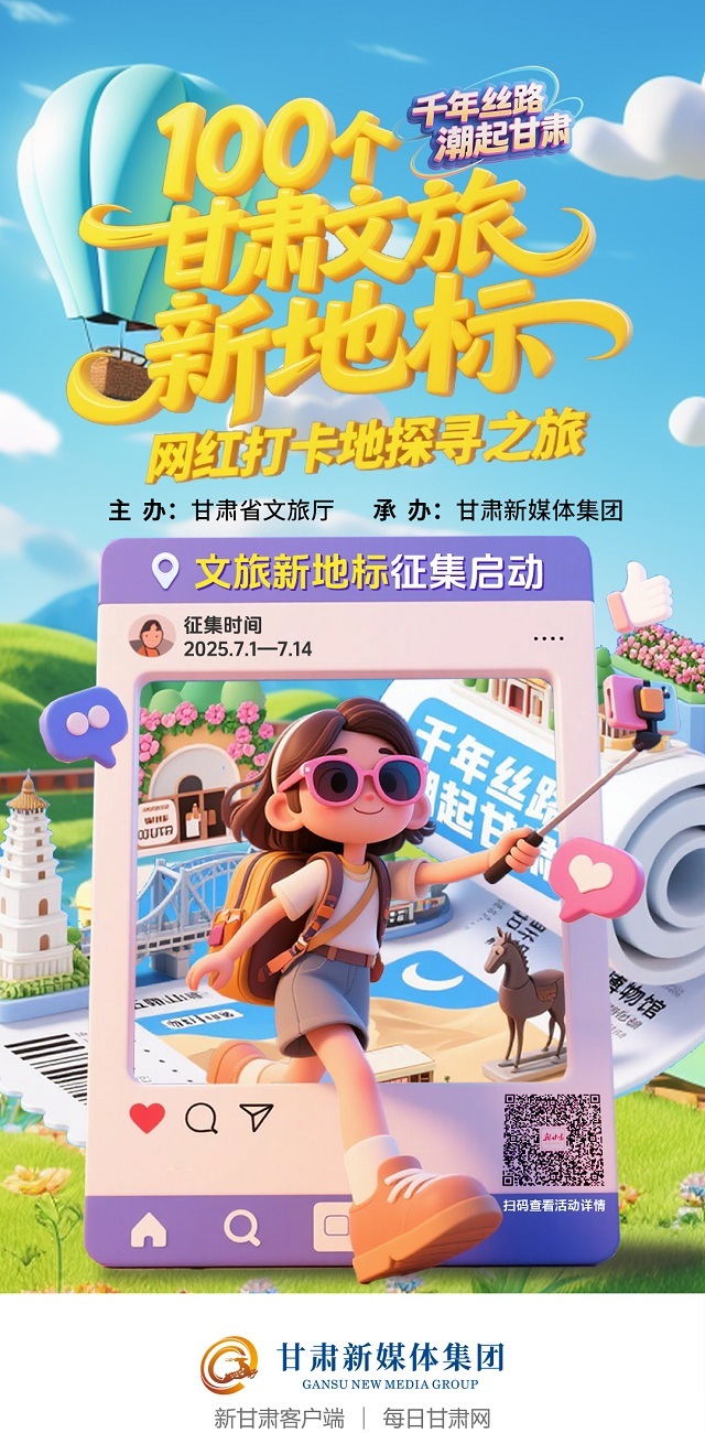 甘肃,是丝绸之路的黄金走廊,驼铃古道与丹霞秘境在此交汇,千年文明在黄河浪涛中生生不息。为挖掘文旅融合新动能、打造全域旅游新高地,甘肃省文化和旅游厅特发起“千年丝路·潮起甘肃——甘肃100个文旅新地标(网红打卡地)探寻之旅”征集评选活动,活动面向全社会公开征集候选地标!无论你是文旅机构、创作者还是热爱甘肃的旅行达人,均可推荐或自荐心中的“甘肃文旅新地标”。征集活动即日开启,持续至7月14日。