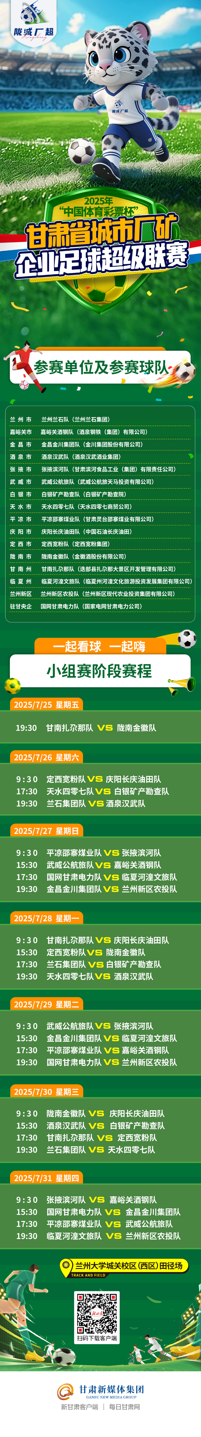 2025年“中国体育彩票”杯甘肃省城市厂矿企业足球超级联赛(简称“陇城厂超”)倒计时2天。16支球队、7天赛程、24场对决,目前,备受期待的小组赛赛程已正式公布,揭幕战于7月25日在兰州大学城关校区(西区)田径场打响。