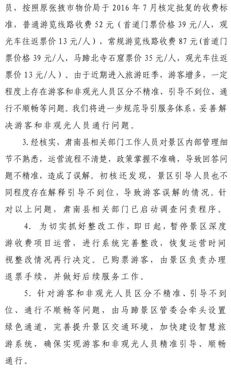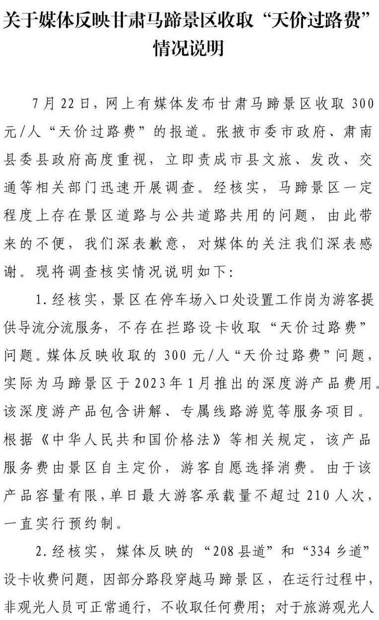 关于媒体反映甘肃马蹄寺景区收取“天价过路费”情况说明