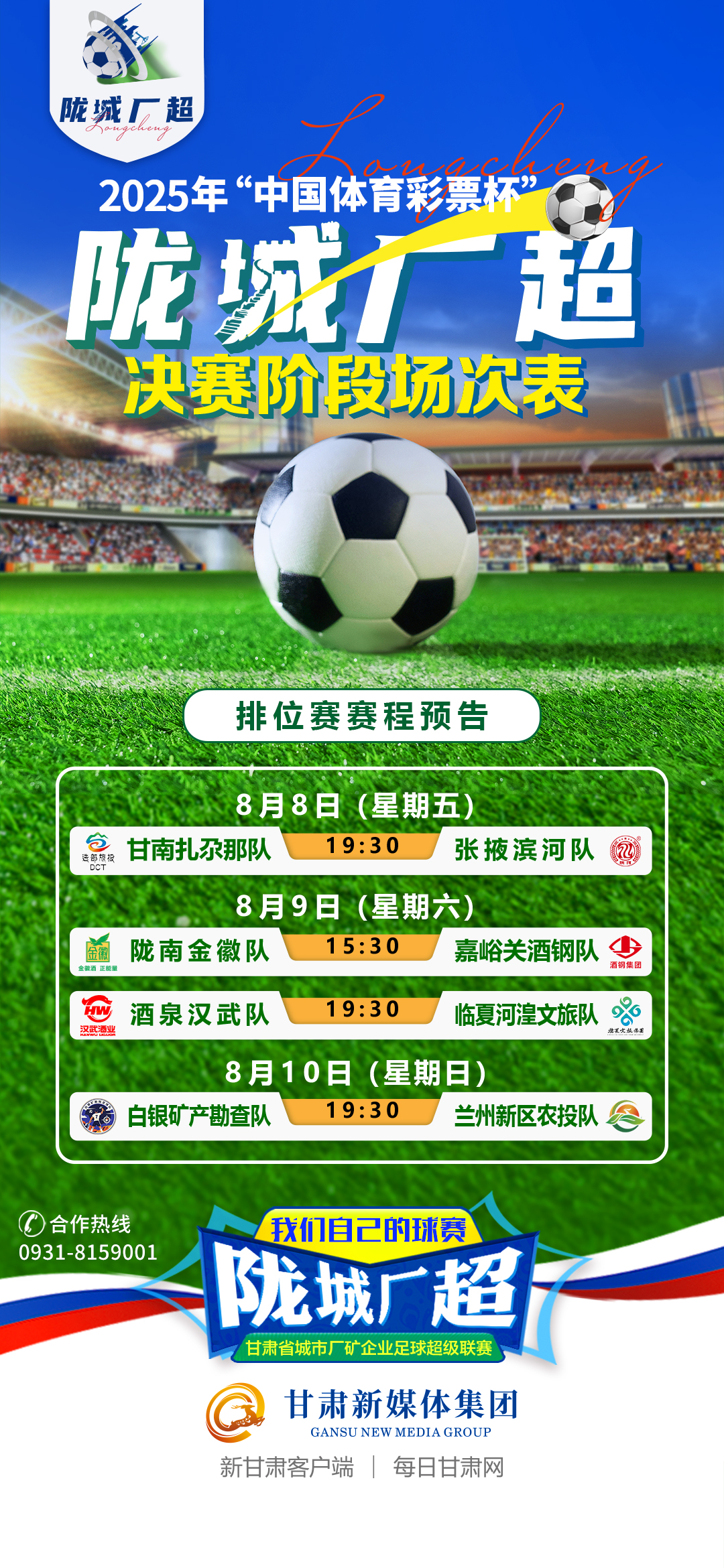进入排位赛阶段,比赛的激烈程度与观赏性将再升一个台阶,每一次攻防转换都可能改写战局,每一个精彩瞬间都值得屏息期待。8月9日15:30,陇南金徽队将与嘉峪关酒钢队展开较量;当晚19:30,酒泉汉武队将迎战临夏河湟文旅队。8月10日19:30,白银矿产勘查队与兰州新区农投队的对决将为八强战画上句点。