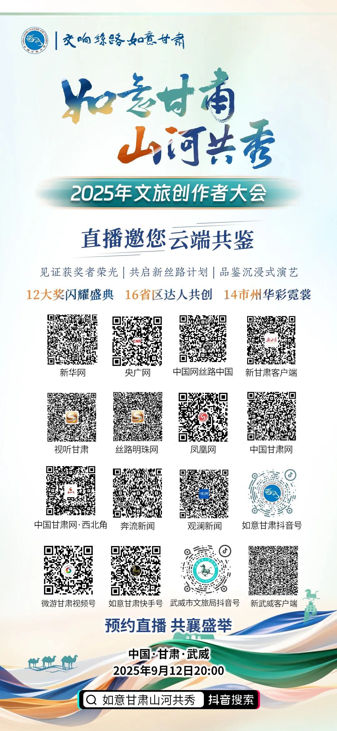 新华网客户端、央广网客户端、新甘肃客户端、视听甘肃客户端、奔流新闻客户端、“如意甘肃”抖音号、“如意甘肃”快手号、“微游甘肃”视频号、“武威市文旅局”抖音号、新武威客户端等16个媒体平台将全程同步直播,欢迎大家线上收看。