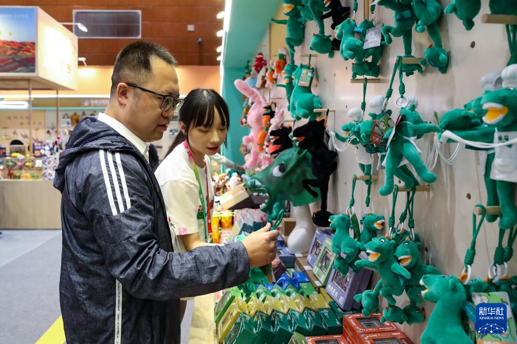 9月21日,与会嘉宾在第八届丝绸之路(敦煌)国际文化博览会上选购非遗文创产品。新华社记者 郎兵兵 摄
