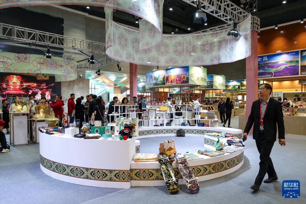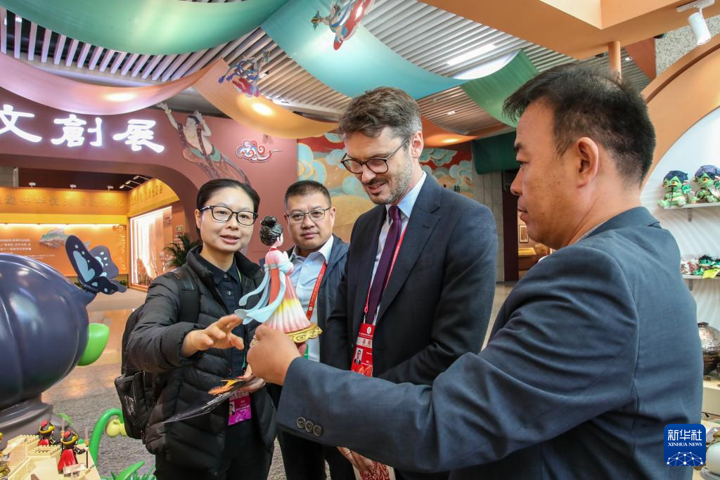 9月21日,与会嘉宾在第八届丝绸之路(敦煌)国际文化博览会上参观甘肃文旅非遗文创展。新华社记者 郎兵兵 摄